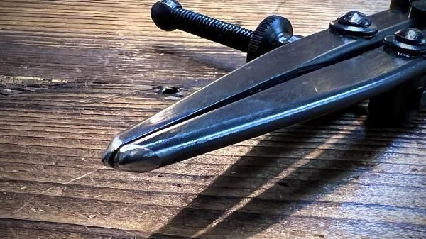 針先を加工することで、ネジ捻と同じ効果が得られコバからお気に入りの巾で菱目の穴明けラインを引く事が可能です。