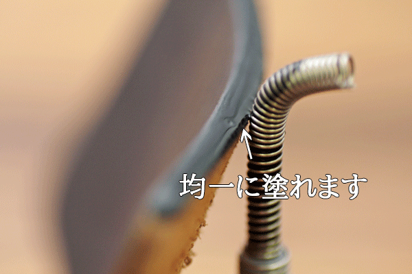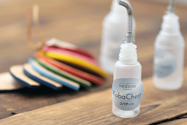 コバチートは、液体の表面張力を利用して、コイルの曲がっている箇所からコバ液を革の表面に置くように散布する、新しい構想から出来た道具です。